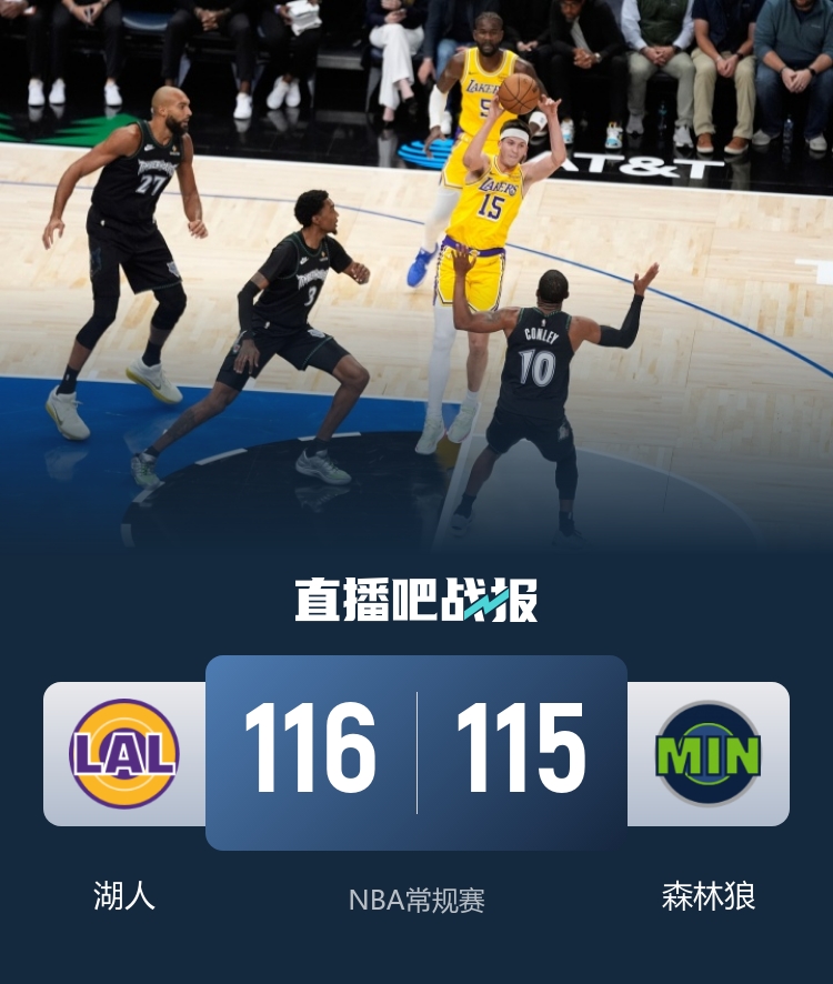 比赛开始,双方开场陷入缠斗,比分咬得很紧,森林狼持续发力打出8-0的攻击波取得领先,湖人多点开花迅速追赶,克内克特高效输出,次节里夫斯开始发力,得分助攻一肩挑帮助湖人反超比分,森林狼命中率下降,连续打铁失误,兰德尔连续拿分止血,半场战罢湖人62-58领先森林狼。易边再战,拉拉维亚成为奇兵,单节6中5独得14分,湖人攻防两端压制对手,一举将分差拉开到20分。森林狼及时回暖缩小分差,末节里夫斯和拉拉维亚联手发力帮助湖人扩大优势,此后湖人突然断电陷入得分荒,森林狼多点开花大举反击,轰出9-0迅速反超,里夫斯最后骑马射箭压哨绝杀!湖人116-115险胜森林狼。